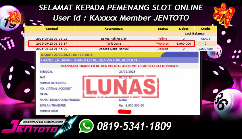 Selamat Kepada Member Jentoto dengan User ID : LE****, hari ini tanggal 23 September 2025 berhasil memenangkan JP di permainan slot gacor maxwin PG Soft hari ini dengan nominal sebesar Rp 6.900.000 dan sudah di bayar LUNAS!