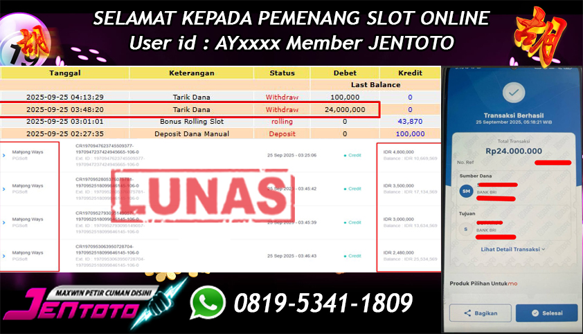 Selamat Kepada Member Jentoto dengan User ID : MO****, hari ini tanggal 25 September 2025 berhasil memenangkan JP di permainan slot gacor maxwin PG Soft hari ini dengan nominal sebesar Rp 24.000.000 dan sudah di bayar LUNAS!