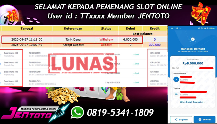 Selamat Kepada Member Jentoto dengan User ID : DE***, hari ini tanggal 27 September 2025 berhasil memenangkan JP di permainan slot gacor maxwin Pragmatic Play hari ini dengan nominal sebesar Rp 6.000.000 dan sudah di bayar LUNAS!!