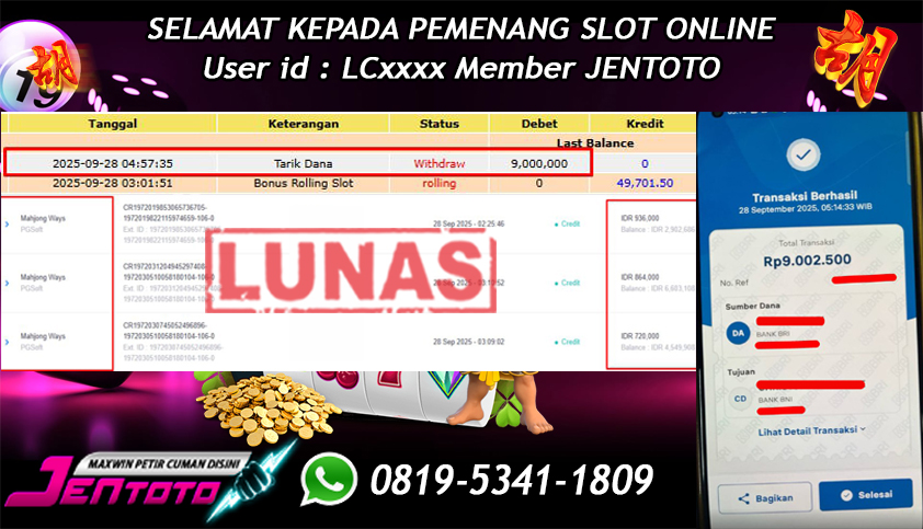 Selamat Kepada Member Jentoto dengan User ID : GE****, hari ini tanggal 28 September 2025 berhasil memenangkan JP di permainan slot gacor maxwin PG Soft hari ini dengan nominal sebesar Rp 9.000.000 dan sudah di bayar LUNAS!